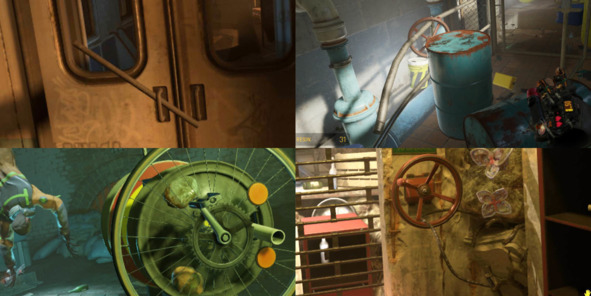 Вентили и кнопки всегда размещают напротив объекта управления – ворота (рис. 1), раскладной лифт (рис. 2), кран (рис. 3). Таким образом, разработчики фокусируют внимание игрока на объекте взаимодействия.
