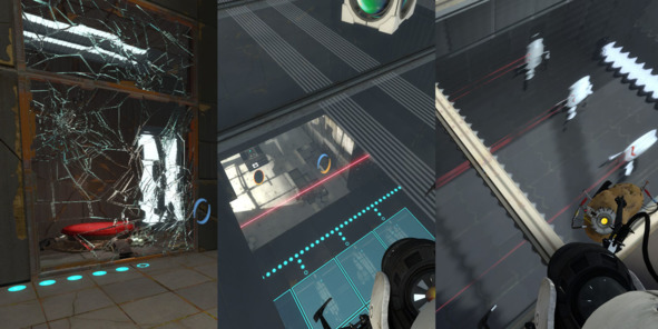 По своей природе большинство тестовых комнат являются серией взаимосвязанных помещений, структура которых не всегда очевидна. Чтобы помочь игроку собрать больше информации о структуре локации и о расположении элементов головоломки в пространстве, дизайнеры встраивают в пол и стены специальные обзорные окна.