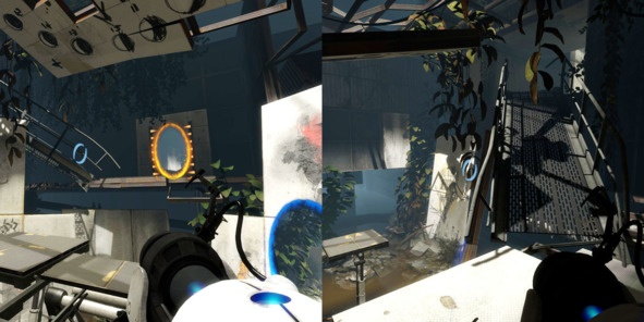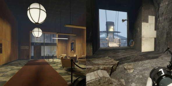 К примеру, в старых лабораториях есть место, где дизайнер специально ведёт нас в тупик с забаррикадированным выходом (рис. 1). Сделано это для того, чтобы сначала ввести игрока в заблуждение, а затем, после разворота, обрадовать функциональной портальной поверхностью (рис. 2).