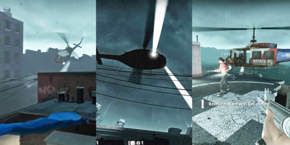 В кампании No Mercy в короткой вступительной кат-сцене появляется вертолёт, оповещающий выживших о точке эвакуации, которая находится на крыше госпиталя. На следующем уровне вертолёт снова напоминает игрокам об их цели. В финале игроки получают возможность сбежать из города на вертолёте, который подбирает их с крыши госпиталя.