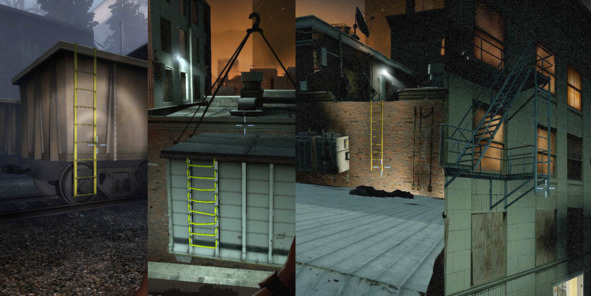 Для повышения читаемости интерактивные лестницы маркируют контрастным жёлтым цветом (рис. 1—3). Декоративные лестницы стараются сделать как можно незаметнее, размещая их в недоступной игроку зоне (рис. 4).