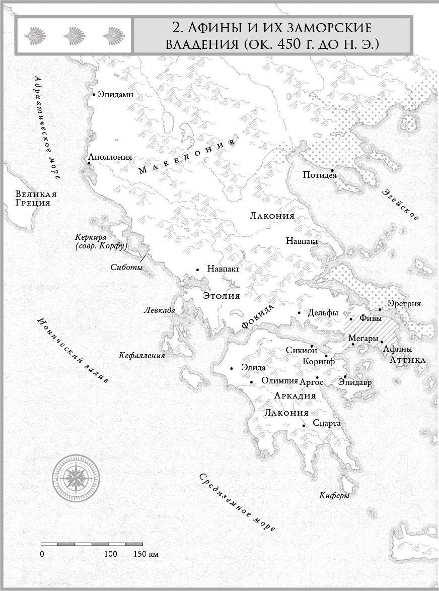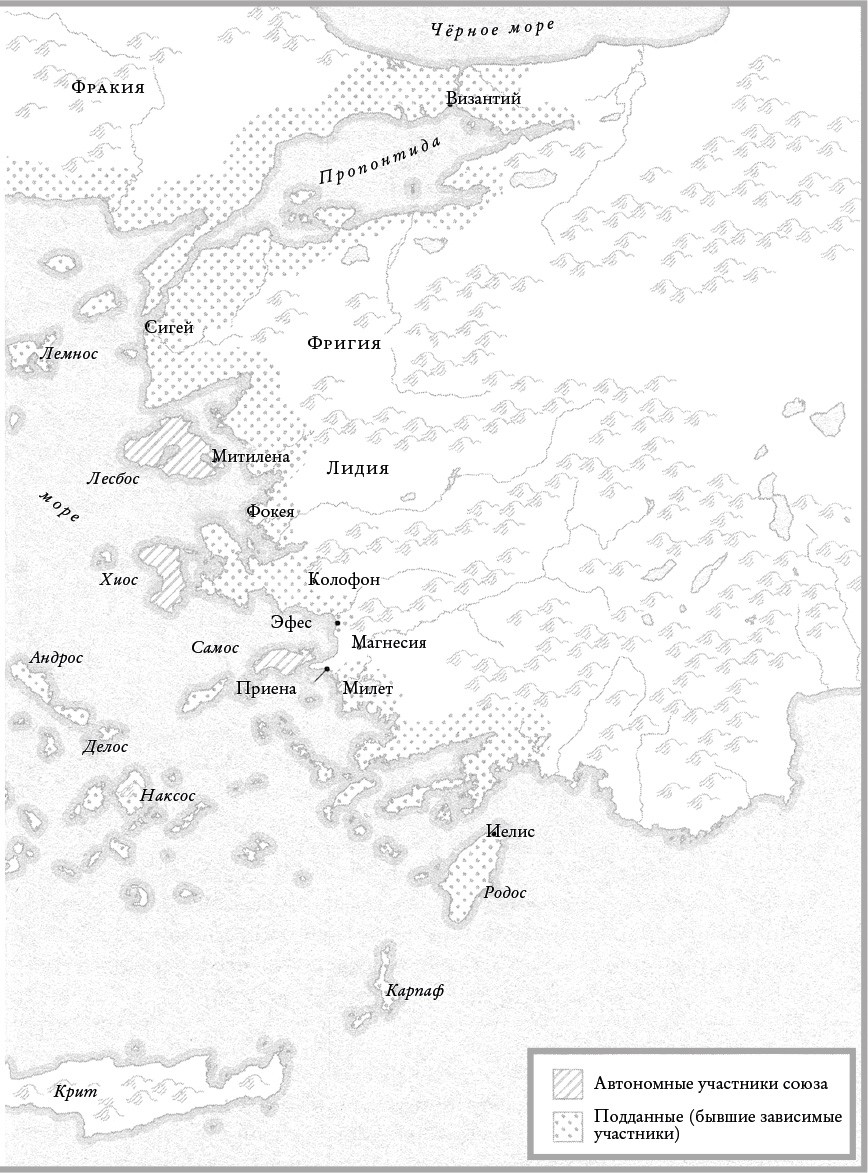 Сила и процветание афинской демократии опирались прежде всего на лидерство могущественной морской империи, сосредоточенной в приморских городах и на островах Эгейского моря. Она зародилась как объединение «афинян и их союзников», которое современные исследователи именуют Делосским союзом, – это был добровольный альянс греческих полисов, призвавших Афины сыграть руководящую роль в продолжении освободительно-мстительной войны против Персии. Постепенно союз превратился в империю под управлением Афин, функционировавшую преимущественно на их благо (карта 2). С годами почти все члены союза отказались от своих флотов, предпочитая делать денежные взносы в общую казну. Афиняне использовали эти средства, чтобы расширять собственный флот, а также платить гребцам, чтобы те работали веслами по восемь месяцев в году, так что в конечном счете Афины обладали крупнейшим и лучшим флотом во всей Греции. К началу Пелопоннесской войны из всех 150 членов союза лишь два острова, Лесбос и Хиос, имели свои флотилии и относительную автономию. Однако даже они едва ли могли ослушаться приказов Афин.