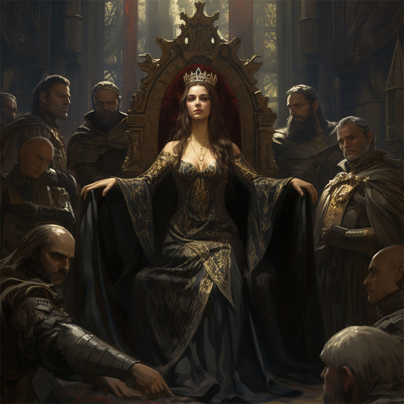 Я вошел в просторный ярко освещенный зал, где у противоположной стены на большом резном троне важно восседал король в массивной золотой короне, но никакой мантии на нем не было. Может, про черные хвосты это все выдумки, а может король просто не посчитал сегодняшнюю встречу особо важной. Рядом с ним, на троне поменьше, сидела королева. В строгом черном платье, а из украшений только изящная корона тонкой работы. Волосы уложены в сложную прическу и прикрыты тонким полупрозрачным платком.