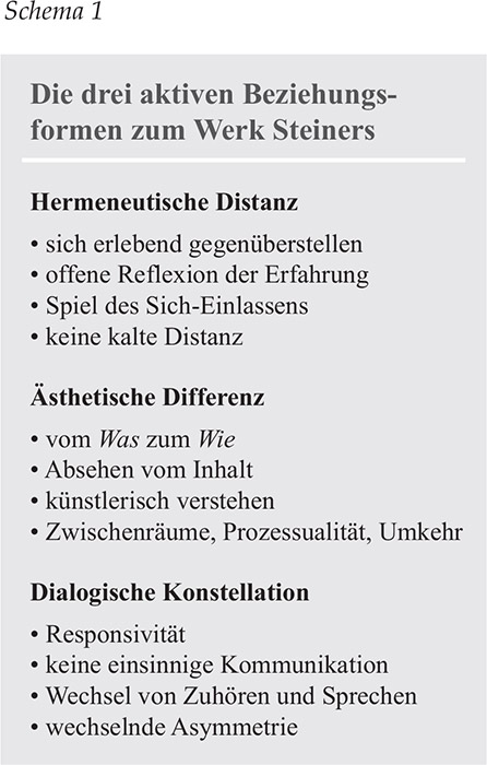Ästhetische Differenz: Darunter verstehe ich das Absehen vom semantischen Gehalt einer Aussage und die Aufmerksamkeit auf ihre Art oder Form. Da es besonders in Steiners Werk sehr unterschiedliche Arten oder Formen von Aussagen gibt, spreche ich sehr allgemein von einer Differenz, also einem »Absehen von« und einem heuristischen »Hinsehen auf«. Es ist ein Achten auf den Unterschied, bei dem zunächst offenbleibt, was die Art der Aussage jeweils ausmacht. Die Regel bedeutet in ihrem Kern einen Vorrang des Wie vor dem Was, wobei das Was nicht bedeutungslos wird. Dafür gibt es im anthroposophischen Kontext verschiedene Vorarbeiten, 73 in konkreten Arbeitszusammenhängen wird Goethes Satz »Das Was bedenke, mehr bedenke Wie?«74 als Motto oder Orientierung gerne zitiert. Grundlegende Studien stehen aber aus.