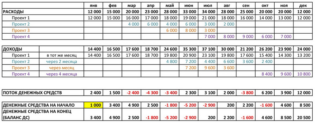 Денежные средства на начало – в нашем примере это условная 1000 руб. свободных денежных средств, которые у вас есть в самом начале рассматриваемого периода. Она может быть равна нулю, либо минусовой – но должна отражать реальное положение дел на сегодняшний момент.