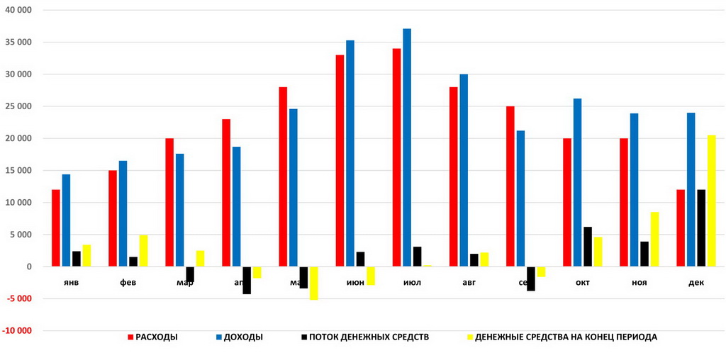 В отдельные периоды (апрель, май, июнь, а также сентябрь) мы наблюдаем отрицательные значения денежных средств на конец периода. Это означает, что имеющихся средств в эти периоды недостаточно, чтобы покрыть отрицательные значения денежного потока. По сути это и есть то, ради чего создан данный метод – предвидение и устранение ситуаций, когда денежных средств не хватает, что мы и видим в данном примере.