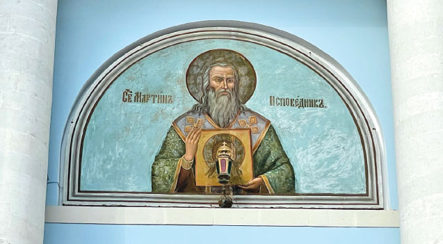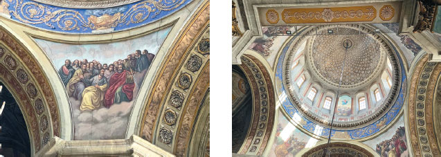 Например, в интерьерах храма Мартина Исповедника на Таганке, а также на фасаде здания сохранились живописные фрески, которые на излёте столетия нанёс живописец Антонио Клаудо. Итальянец. И своей родной Италии он дал тут по максимуму. Так, на парусах храма, под барабаном, появились несвойственные православию изображения пророка Моисея и апостола Петра в окружении множества фигур.