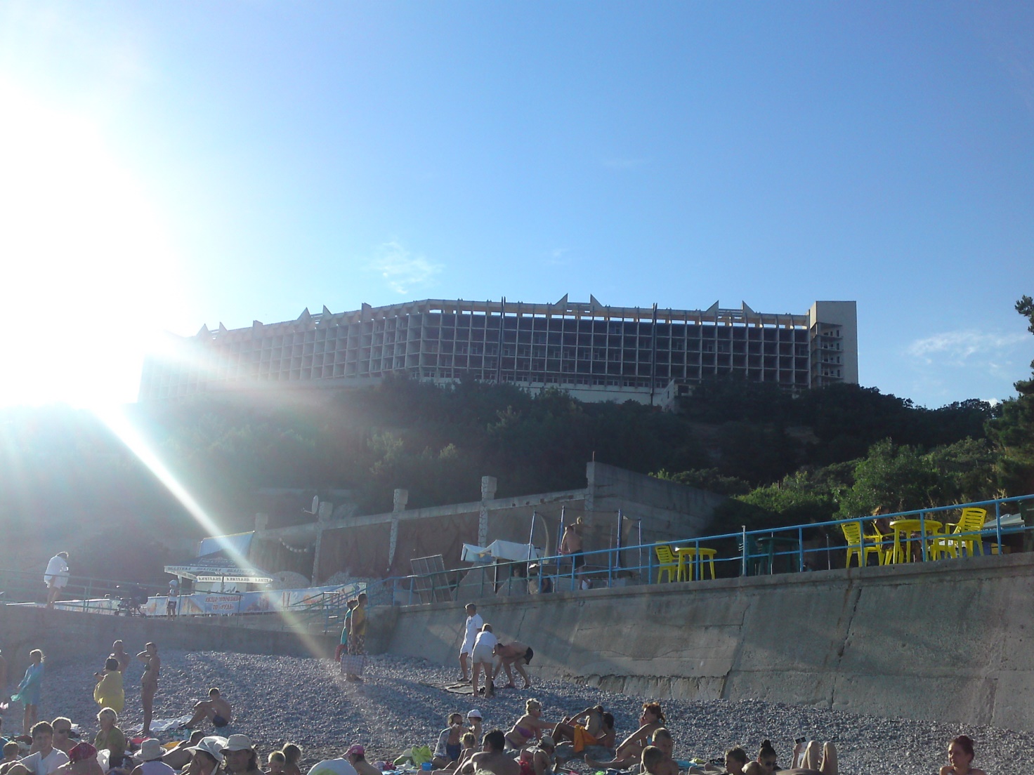 Массивный и благоустроенный пансионат с благозвучным названием «Дом Творчества Учёных «Кацивели» – это творение мечты государства, которое хотело, чтобы каждый человек смог отдохнуть в этом прекрасном месте. А к отдыху располагало всё: уютный номер, трёхразовое питание, близость к морю, освещённая и асфальтированная территория, по которой можно гулять и дышать свежим воздухом; а главное – великолепные пляжи со всеми удобствами, где не страшно отдыхать с детьми. Что же мы имеем в итоге? Давно не ремонтировавшийся, но ещё функционирующий ДТУ «Кацивели» принимает постояльцев по завышенным ценам. Уход за территорией минимальный, дорожки и асфальтовые покрытия приходят в негодность, но не тают от воды в отличие от современного асфальта. Для отдыхающих ДТУ «Кацивели» выделено только три ближайших пляжа, и для этого было две причины. Первая причина заключалась в жалобах отдыхающих: «такие деньги платим, а ходить нужно далеко из-за того, что отдыхающие из посёлка занимают и переполняют ближайшие пляжи»; вторая причина – эти три пляжа успели облагородить наилучшим образом. На них были убраны опасные подводные камни, завезена щебёнка, которая под воздействием морских волн превратилась в приятную на ощупь гальку. По словам Нины, начиная с 1987 года, грузовик с щебёнкой не появился здесь НИ РАЗУ.