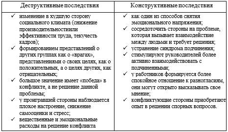 Основой любой организации является его коллектив, а именно люди, без которых организация в целом не может функционировать. Последствия, которые, несет за собой конфликт, могут быть хорошими и плохими, т.е. конструктивными или деструктивными, которые показаны в таблице 1.1. Таблица 1.1−Конструктивные и деструктивные последствия конфликта