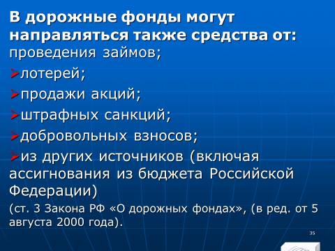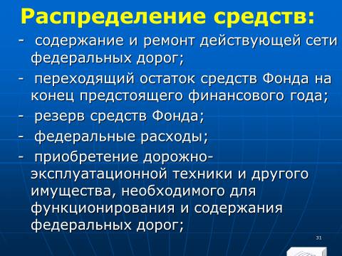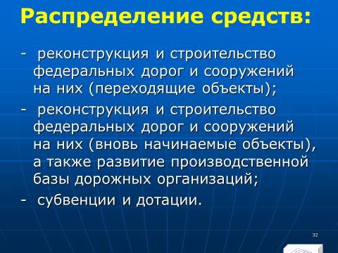 1. финансирование содержания, ремонта, реконструкции и строительства автомобильных дорог общего пользования, относящихся к федеральной собственности РФ