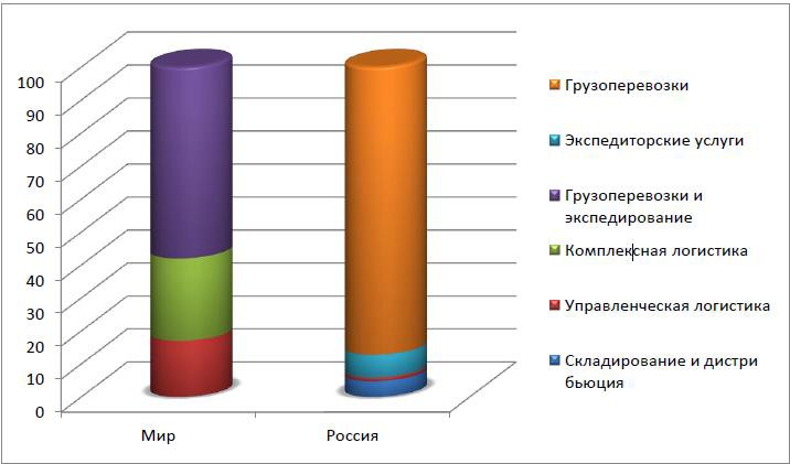Для того чтобы оценить и сравнить уровень развития транспортно- логистических услуг России по сравнению с миром посмотрим на рисунок 1.5, иллюстрирующий структуру рынка транспортно-логистических услуг.