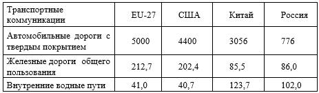 Одним из главных факторов, оказывающих наибольшее влияние на организацию транспортной логистики, являются транспортные коммуникации. Рассмотрим протяженность транспортных коммуникаций в разных странах мира (таблица 1.4).