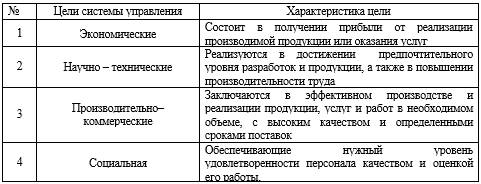 Цели системы управления напрямую зависят от специфики деятельности компании и объемов ресурсов деятельности в организации. Руководитель предприятия должен адекватно оценить достижимость поставленной цели и количество времени необходимого для ее реализации. Изначально все цели управления организации можно разделить на четыре группы (таблица 1.1).