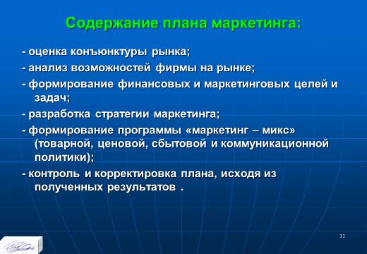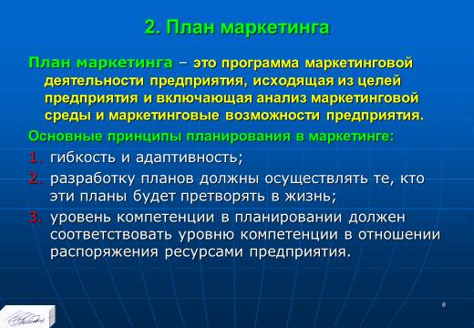 +1. программа маркетинговой деятельности предприятия, исходящая из целей предприятия и включающая анализ маркетинговой среды и маркетинговые возможности предприятия;