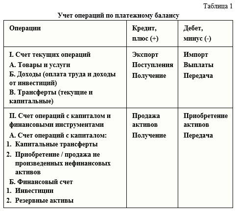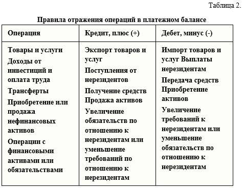 Это прежде всего бухгалтерский метод двойной записи, т.е. разнесения операций резидентов с нерезидентами по двум колонкам, именуемым «кредит» и «дебет», разница между которыми называется «сальдо». Правила отражения операций в платежном балансе по кредиту и дебету таковы (таблица 2).