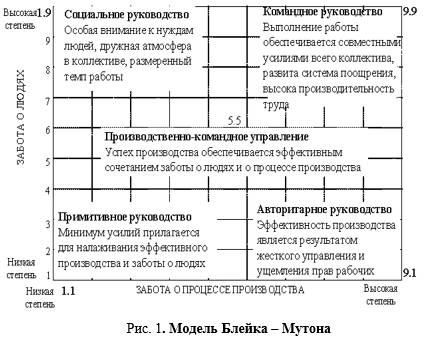 На рисунке 1 представлена модель Блейка – Мутона, включающая 5 основных стилей руководства. Вертикальная ось этой схемы ранжирует “заботу о человеке” по шкале от 1 до 9. Горизонтальная ось ранжирует “заботу о производстве” также по шкале от 1 до 9. Стиль руководства определяется обоими этими критериями. Всего мы получаем 81 позицию (9х9), т.е. 81 вариант стиля управления. Блейк и Моутон описали пять крайних и наиболее характерных позиций матрицы.