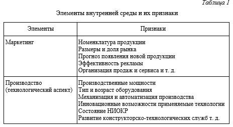 влияние этого фактора основное (смена продукции осуществляется через 3-4 года), а для нефтяной компании – низкое. Далее, установив круг наиболее значимых элементов, необходимо установить перечень признаков, который будет использован для оценки элемента среды. В табл. 1 в качестве примера рассмотрены два элемента внутренней среды и их признаки.