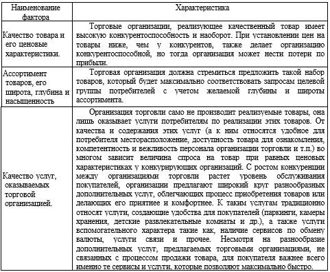 Конкурентоспособность торговой организации определяется множеством факторов, которые можно объединить в три большие группы: качество товара и его ценовые характеристики; ассортимент товаров, его широта, глубина и насыщенность; качество услуг, оказываемых торговой организацией, как представлено в таблице 1.4.