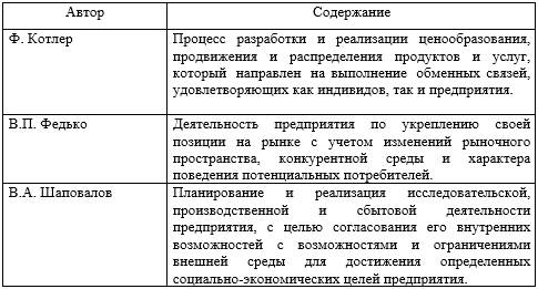 Рассмотренные определения подчеркивают адаптивное направление маркетингового процесса, отражающее управленческий процесс на предприятии в зависимости от воздействия внешних факторов.