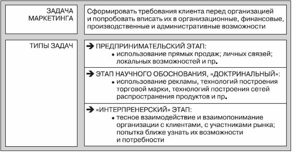 Следует отметить, что задачи, которые выдвигает маркетинг, не являются отдельно стоящими мероприятиями, это направленный комплекс действий, который управляет целым предприятием. При этом на разных ступенях организационного развития существуют разные виды задач, а, следовательно, и разные маркетинговые этапы в работе предприятия.