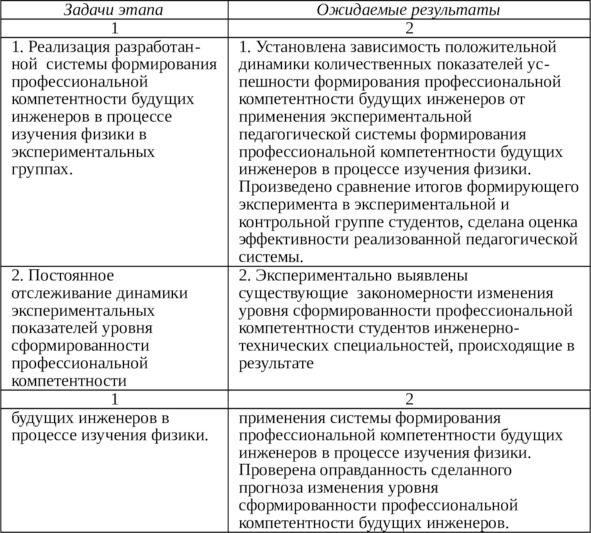 Организационно-методическая реализация экспериментальной работы в целях проверки выдвинутой гипотезы исследования может включать в себя четыре этапа: поисковый, констатирующий, формирующий, контрольный. Планирование проведения аналитико-экспериментальной работы в этом случае заключает в себе следующие элементы рациональной организации проверки эффективности гипотезы исследования: оптимальный выбор и теоретический анализ исследуемых параметров и характеристик успешности формирования профессиональной компетентности будущих инженеров (поисковый эксперимент); определение первоначального состояния изучаемого объекта – уровня сформированности профессиональной компетентности будущих инженеров, достигаемого в традиционном обучении физики в техническом вузе (констатирующий этап); оценка результатов реализации сконструированной и научно обоснованной педагогической системы (формирующий этап), обобщенный статистический анализ результатов исследования (контрольный этап). Подробная информация о задачах и ожидаемых результатах перечисленных этапов успешно реализованного педагогического эксперимента приведена ниже в Таблицах 1.2.1, 1.2.2., 1.2.3, 1.2.4.
