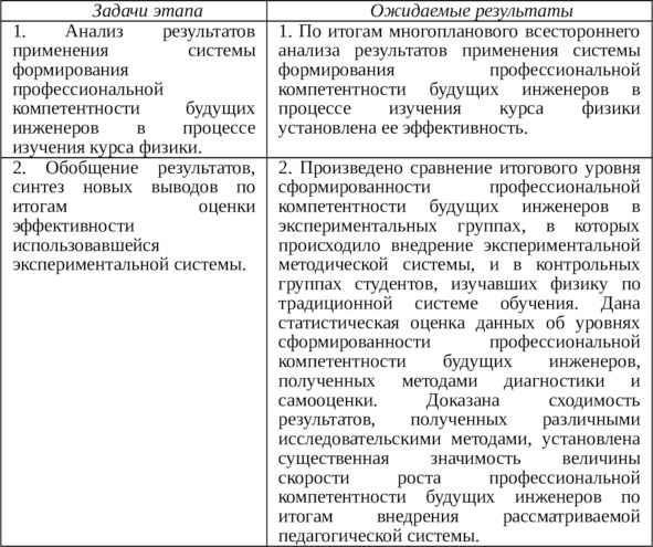 – проведение анализа (в целях прогнозирования и педагогической коррекции получаемых результатов) изменения уровня сформированности профессиональной компетентности будущих инженеров в результате применения экспериментальной методической системы.
