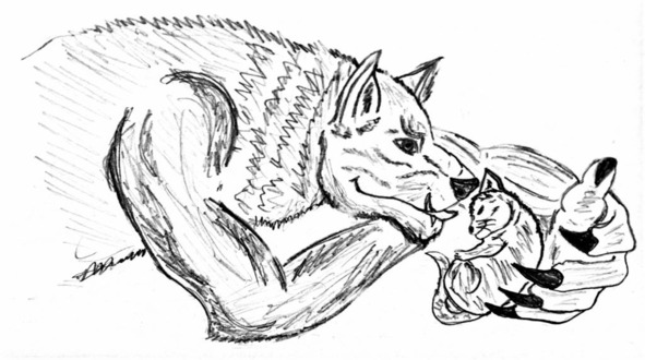 Джек подбежал к ним и начал скалиться и лаять. Один вынул нож, а другой умудрился ударить Джека ногой. Это была фатальная ошибка. На их глазах начало происходить чудо! Шерсть вздыбилась, с ужасным треском захрустели кости в почти мгновенном, быстром увеличении тела, вместе с телом увеличивалась и морда, с ужасно большими клыками, с которых обильно капала слюна. Сверкнули во тьме ярко желтые глаза. Джек схватил обоих за грудки своими огромными, волосатыми ручищами и начал их трясти, как тряпичные куклы, не забывая по шире открывать пасть и страшно рычать. Один начал кричать, писклявым от страха голосом: