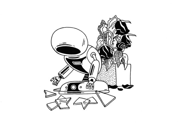 Перед окнами в больших разномастных вазонах зеленели домашние растения. Дальше Лина подошла к розовому кусту с поникшими розами и завядшими нераспустившимися бутонами. Следующий кадр – перед диваном, склонившись до пола, как будто сложенный пополам, стоял робот в куче тёмных стеклянных осколков.
