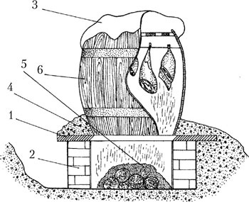 Рис. 3. Бочка-коптильня для горячего копчения: 1 – железный лист с отверстиями; 2 – камни или красный кирпич для опор; 3 – крышка бочки с мелкими отверстиями для выхода дыма; 4 – слой земли, защищающий очаг и низ бочки от утечки дыма и тепла; 5 – топка; 6 – бочка-коптильня