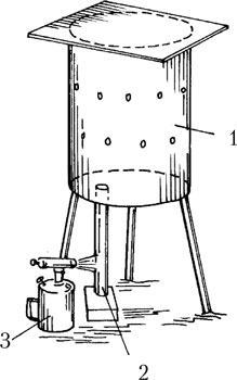 Рис. 4. Коптильня В. Труфанова: 1 – бочка с отверстиями для проволоки; 2 – «стакан» с опилками; 3 – паяльная лампа