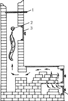 Рис. 8. Коптильня в дымоходной трубе: 1 – шибер; 2 – прут для подвешивания продуктов; 3 – дверца коптильни