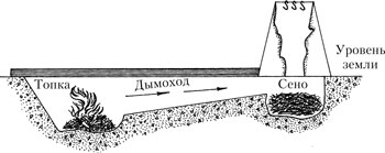 Обе ямки соединяют между собой узкой канавкой (15–20 см) с уклоном в сторону топки, чтобы дым лучше поднимался. Землю утрамбовывают, иначе стенки могут осыпаться. В топочной ямке стенка, противоположная «дымоходу», должна быть пологой (рис. 10).