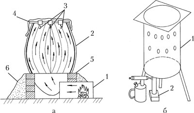 а – схема коптильни из бочки: 1 – печка (стрелками обозначено направление выхода дыма); 2 – корпус бочки без дна и крышка; 3 – вешала; 4 – мешковина; 5 – кирпичи; 6 – земля; б – коптильня из бочки с использованием паяльной лампы: 1 – бочка с отверстиями; 2 – труба с опилками