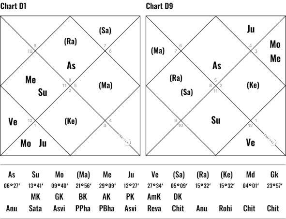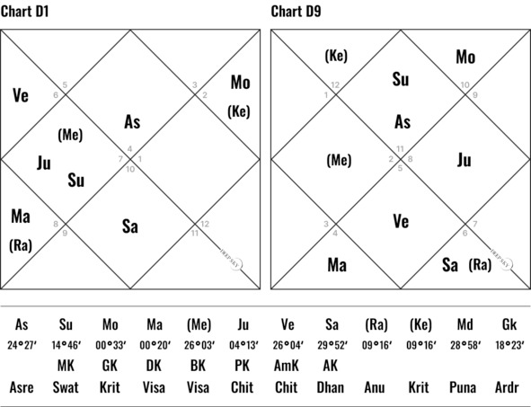 Venus from the temporary lagna is exalted in the seventh house, but it is conjunct the star Bayten-Keitos in the constellation of Cetus. It can bring: “Fatal changes, depression, danger of death. Humiliation, denials and obstacles.”