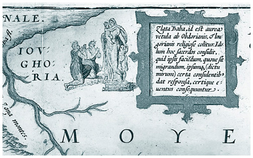 Zlata Baba в виде женщины с двумя детьми в Югории на «Карте Руссии, Московии и Тартарии» Энтони Дженкинсона. 1562 г.