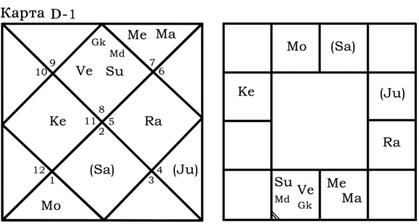 А вот пример гороскопа, в котором Gk играет важную роль для Марса и брачной жизни хозяина гороскопа. Упаграхи находятся в одном знаке с управителем 7-го дома.