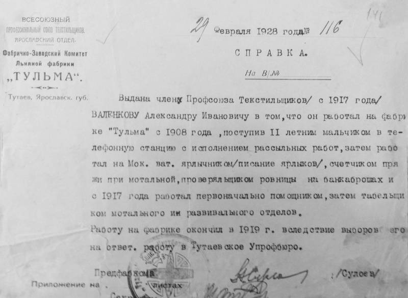 Для более полного понимания содержания жизни тех времён также интересны автобиографические воспоминания А.И. Валенкова. В 1969 году он писал, что с двухлетнего возраста вместе с родителями переехал из Даниловского уезда в город Романов-Борисоглебск. Отец поступил работать на фабрику и через шесть лет умер.