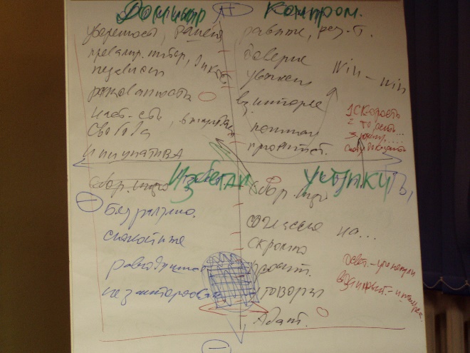 На фото можно увидеть (точнее, разглядеть) аналогичную работу, проделанную группой тренинга по теме соответствия переговорной позиции и применяемого инструментария.