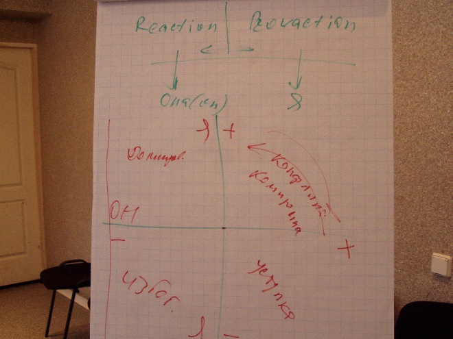 На фото мы видим результат работы тренинговой группы над сочетанием переговорной позиции и балансом «Реактивность – проактивность».