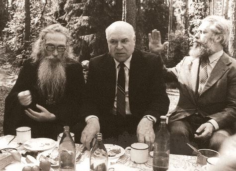 Архимандрит Кирилл (Павлов), Марк Анатольевич Трофимчук и протоиерей Валентин Радугин на природе в дни юбилея окончания Духовной семинарии, 1975 год