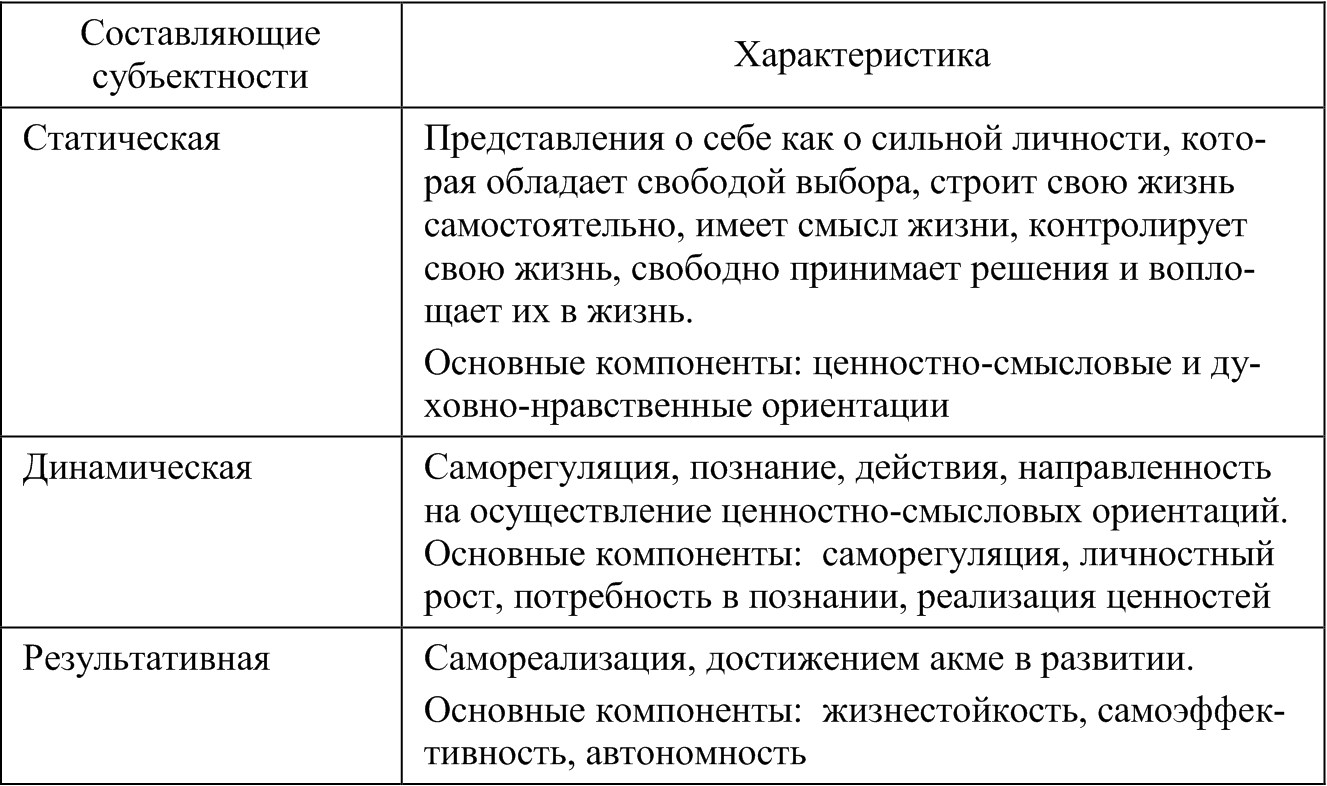 Субъектность рассматривается как психологическое образование, основой которого является отношение человека к себе как к активно действующему субъекту. Факторы субъектности: гуманистическая мотивация, внутренний локус контроля, гибкая, открытая Я-концепция. «Субъектность возникает и развивается в результате взаимодействия людей при осуществлении деятельности8».