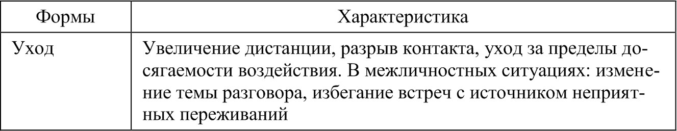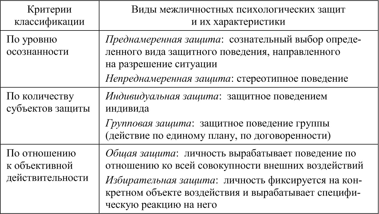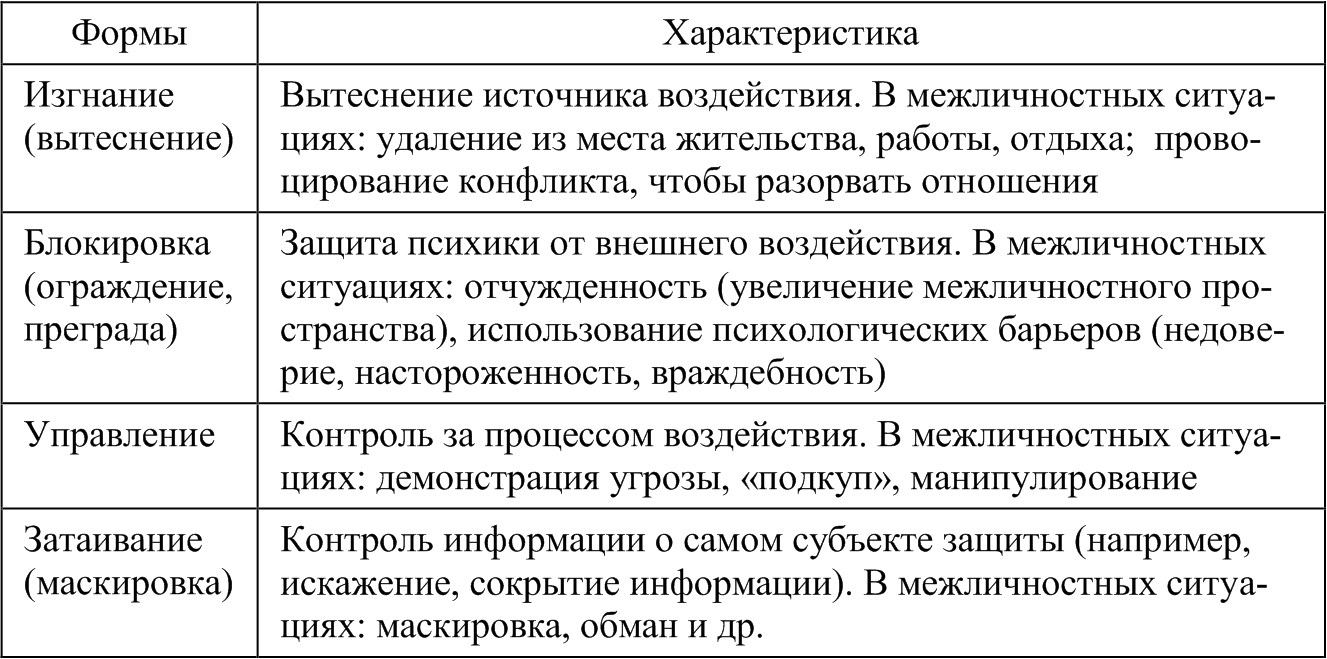 Межличностная защита проявляется в различных формах и способствует разрешению травмирующей ситуации. Е. Л. Доценко выделяет пять форм психологической защиты: «бегство, уход в укрытие, замирание (маскировка), нападение (уничтожение, изгнание) и контроль (управление)23».