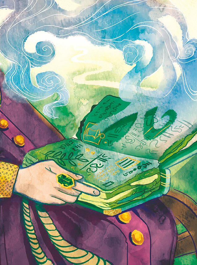 Вместе с торговым караваном, удобно развалившись в повозке, ехал в сторону Лесоводья богатый купец. В руках он держал толстую книгу. Обложка её была покрыта мягким зелёным мхом и украшена золотыми узорами из причудливых цветов. Страницы были сделаны из больших тонких листьев, исписанных непонятными закорючками.