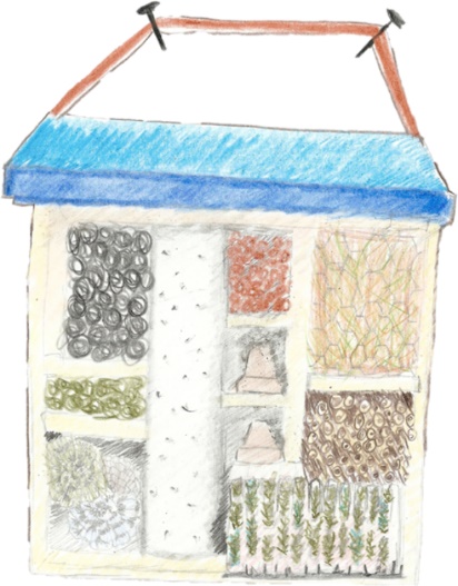 „Die Holzwolle hier ist für Marienkäfer, Ohrwürmer und die Florfliegen. Auch das Stroh und die Tannenzapfen werden gern von diesen Tieren genutzt. Und für die Zeit, wenn es ab Herbst kälter wird, habe ich für die einzelnen Zimmer noch entsprechende Abdeckungen gebaut, die ich dann zum Schutz vor Kälte, Wind und Feuchtigkeit befestigen kann.“