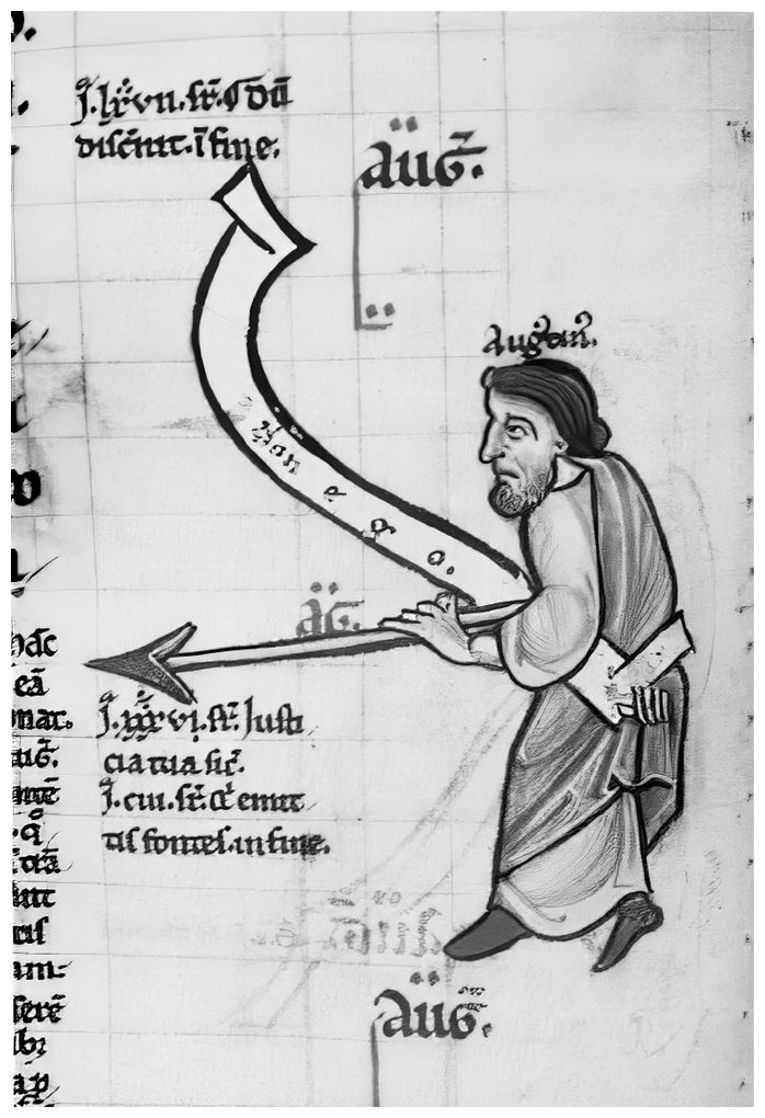 Glossa Ordinaria («общепринятая глосса»), большой комментарий к Библии, доведенный до совершенства в школах Парижа, и комментарий к псалмам Петра Ломбардского служат важными примерами подобного нового подхода к чтению в конце XIX века [19]. В рукописях глосс Питера Ломбарда фигуры и действия иногда изображаются на чистом пергаменте по бокам страницы не столько для иллюстрации, сколько для комментариев к соседнему тексту. В рукописи, подаренной Кентерберийскому собору в конце XIX века, изображен Августин, указывающий пикой на святоотеческий комментарий, где на него ссылаются, и он же держит свиток с надписью «non ego», как бы сообщая: «Я этого не говорил» (илл. 5). Глосса здесь буквально «говорит» в терминологии Гуго Сен-Викторского, высказываясь не за текст, а против него.