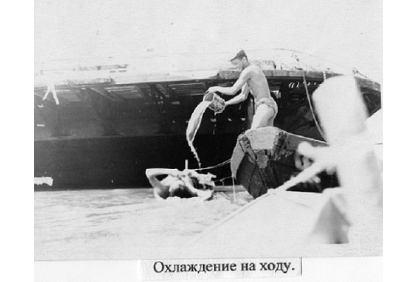 Так он и ехал, наполовину свесившись за корму, а мы разместились на палубе. В дороге надо было питаться. Костер на палубе мы разводить не стали, нам разрешили варить гречку с тушенкой и какао на камбузе.