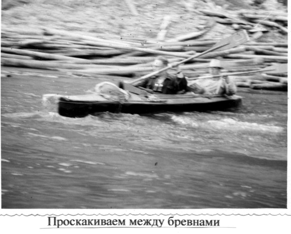 Мы кучу обнесли и опустили байдарки на воду ниже затора. Дальше нам надо было спуститься вместе с плывущими бревнами вниз по реке, пристать к другому берегу и вытащить из воды байдарки в промежутке между плывущими бревнами, чтобы они не раздавили наши байдарки, как яичную скорлупу, или у берега или в затоне.
