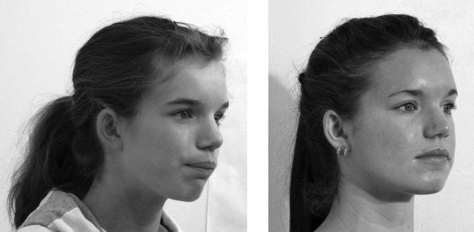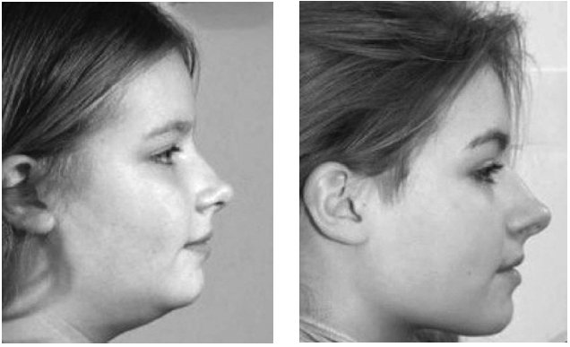 Рисунок 8. Девочке слева сказали, что для исправления ее опущенного подбородка необходима операция. Ортотропическое лечение с помощью системы Biobloc и упражнений по исправлению осанки лица привели к поразительным результатам, которые можно увидеть на правой фотографии. Ни ортодонтия, ни ортопедия не могут гордиться такими впечатляющими изменениями челюсти (Фотографии любезно предоставлены Джоном Мью)