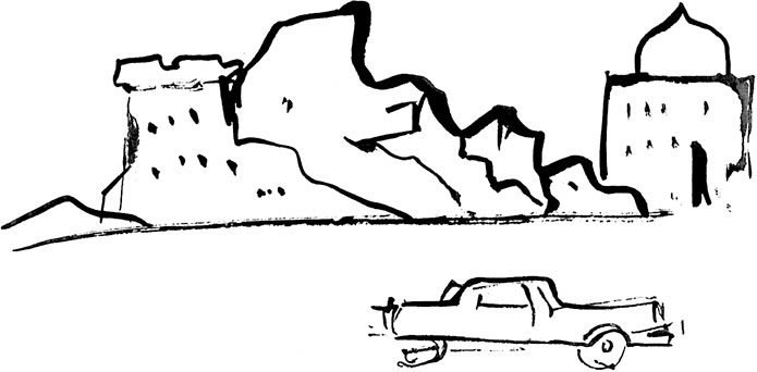 Позавтракали в Бами, в станционном буфете. Пили отличный холодный компот. Быстро добрались до Кызыл-Арвата, заправили канистру, купили очки, расспросили дорогу, и ту началось самое интересное. Грунтовую дорогу после недавнего ремонта разбило до такой степени, что в пыли мы не видели друг друга. Пыль глиняная, рыжая, и по колено. В духоте в самую жару мы не могли открыть дверные стёкла. Машина стала неопределённо-жуткого цвета. На моторе, как и на нас, пять пальцев этой пыли.