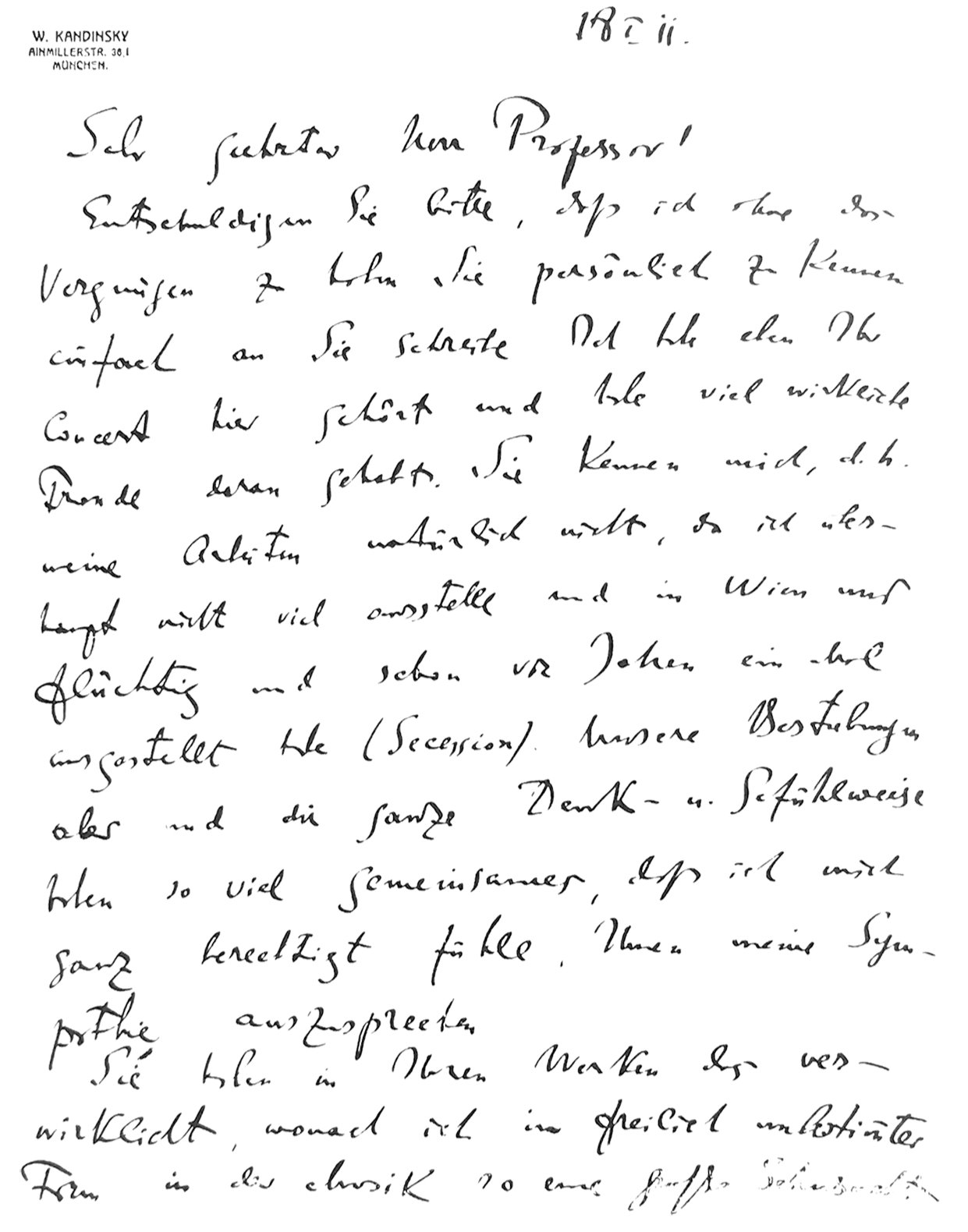 Очень жаль, что меня не было в Мюнхене. Быть может, мы бы там познакомились. Впрочем, это непременно произойдёт. Либо в Мюнхене, либо в Вене. Полагаю, нам будет о чём поговорить. Заранее радуюсь этому и жду от Вас письма. А пока – мой самый сердечный привет,